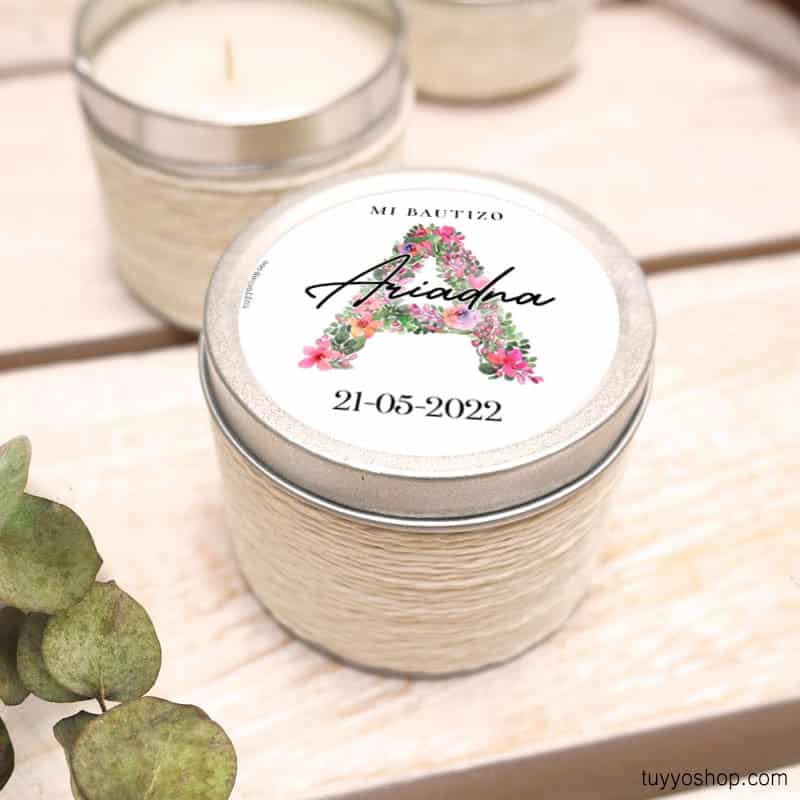 - Vela para bautizo en latita, personalizada, modelo Inicial floral