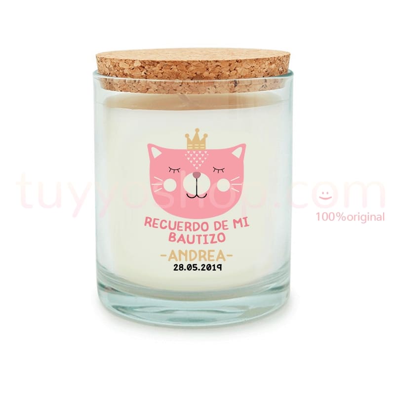 - Vela para bautizo. Modelo Cat Princess. Personalizable. Tapón de corcho.